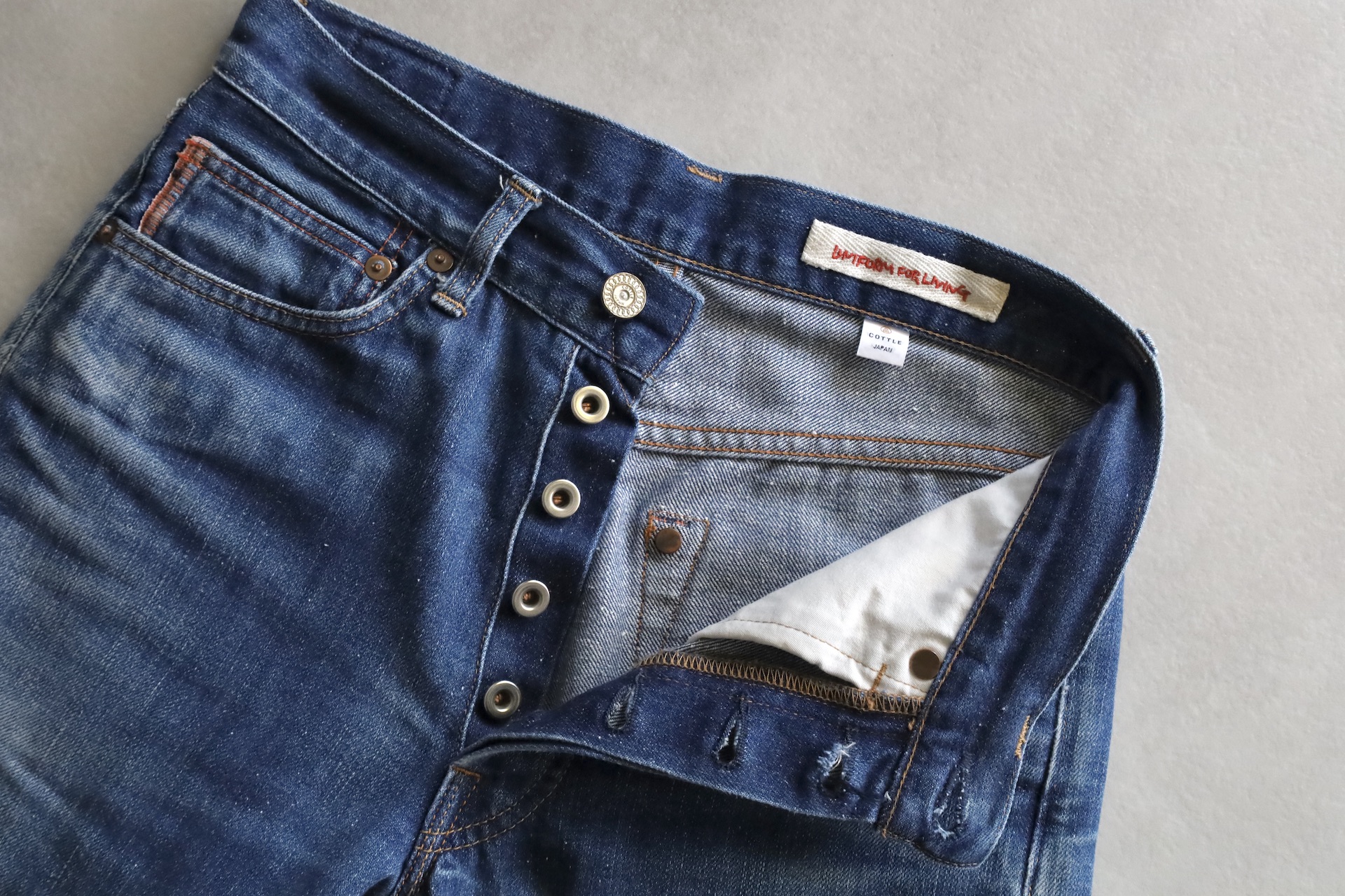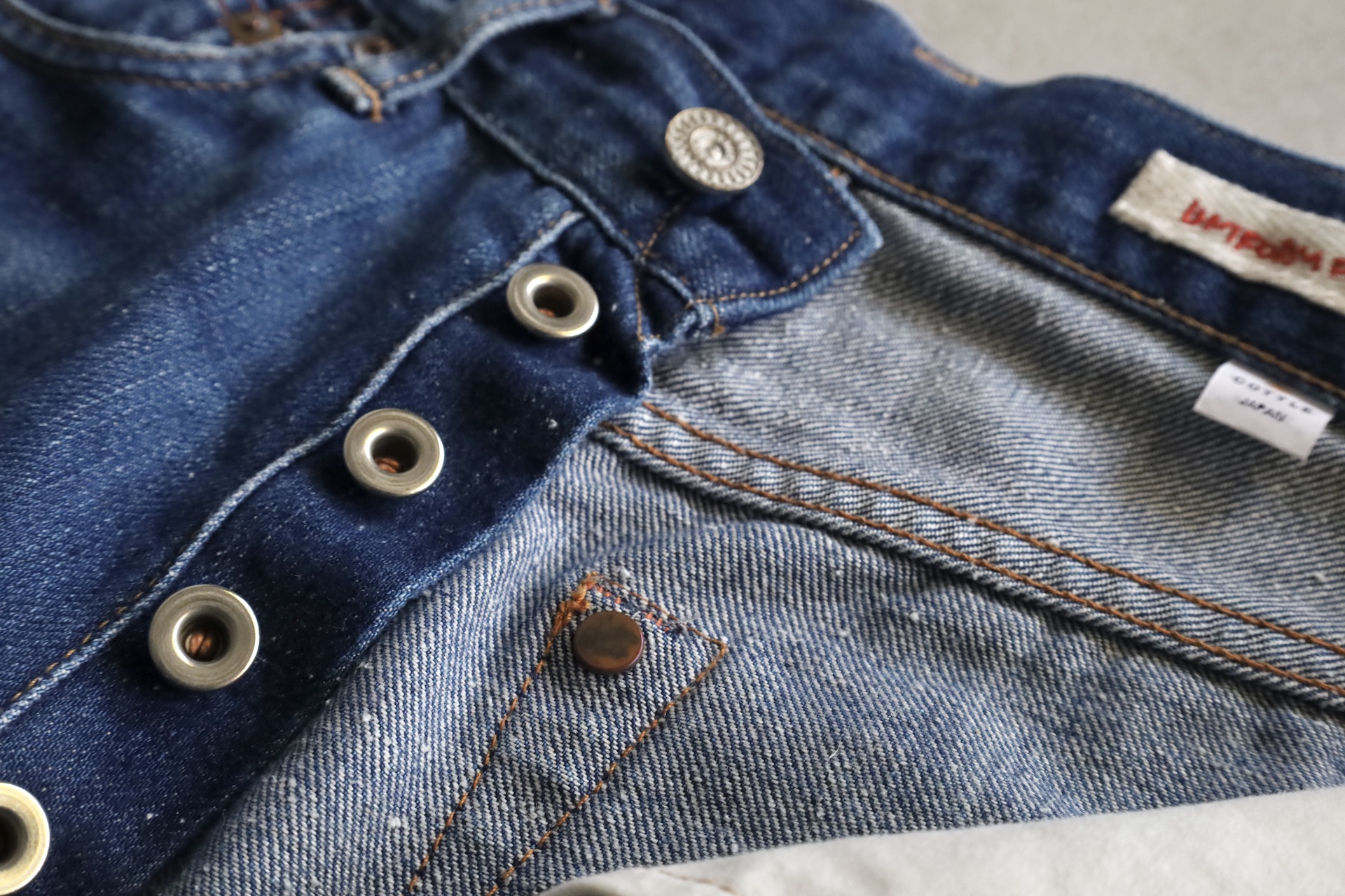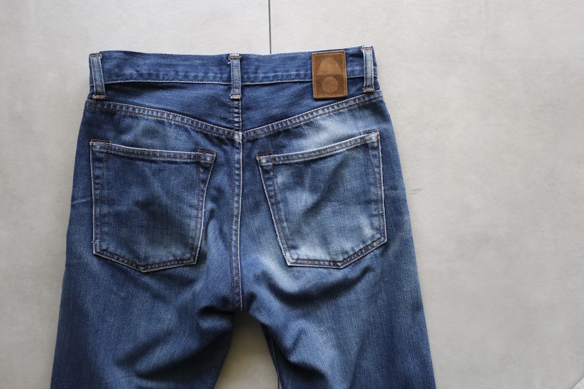 After wearing them for three and a half years, I find the twisted seam puckering created by the 8 mm-wide chain stitch, together with the natural fading of the fabric and the contrast of the brand’s original bengara-dyed selvedge, to be truly beautiful.