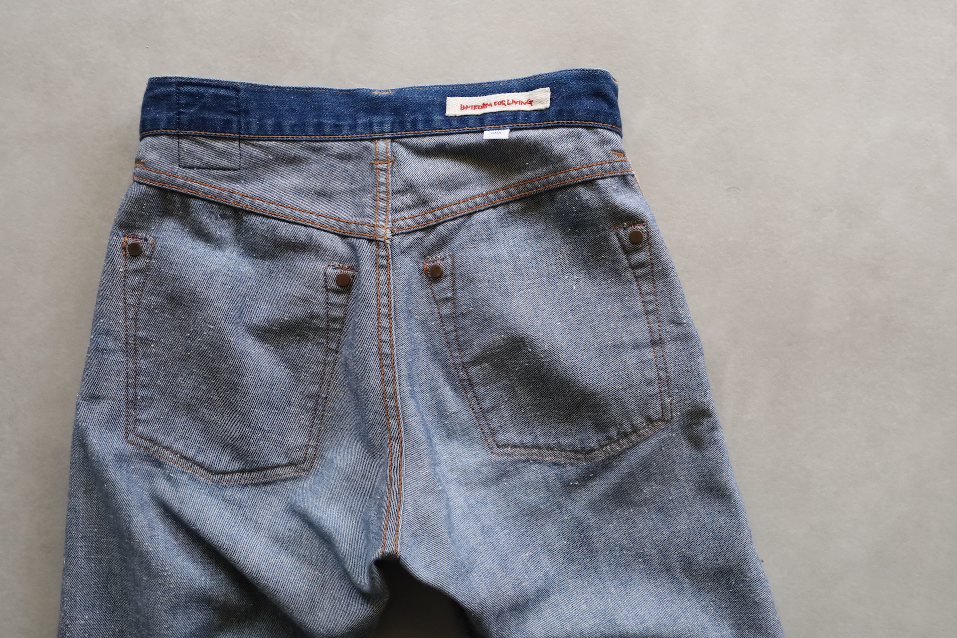 生地幅の狭いセルヴィッチ生地の取り都合というものもあったと思いますが、そうすることでバックヨークがしなやかに伸び、腰へフィットすることにもつながると思いますが、褪色していくデニムが地の目が変わることで色合いのコントラストが生まれます。