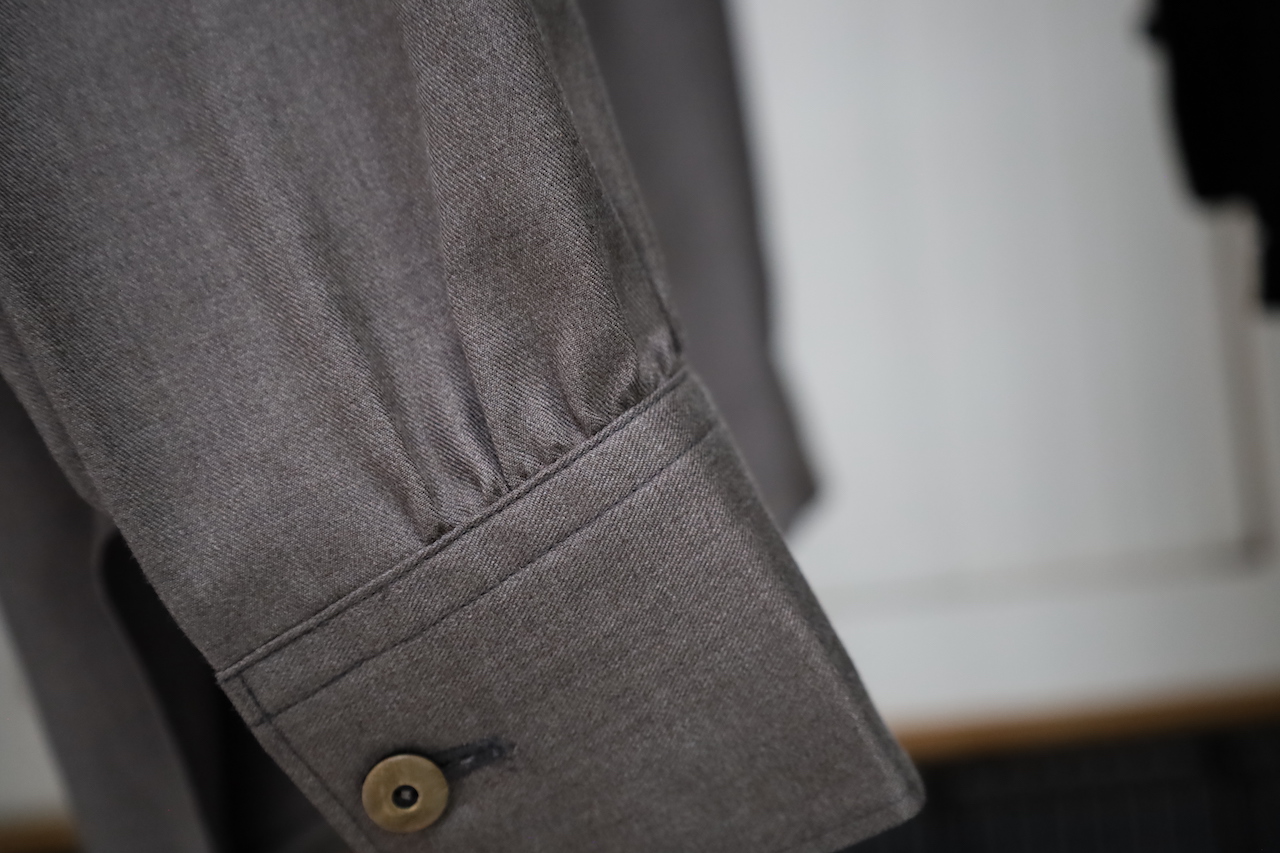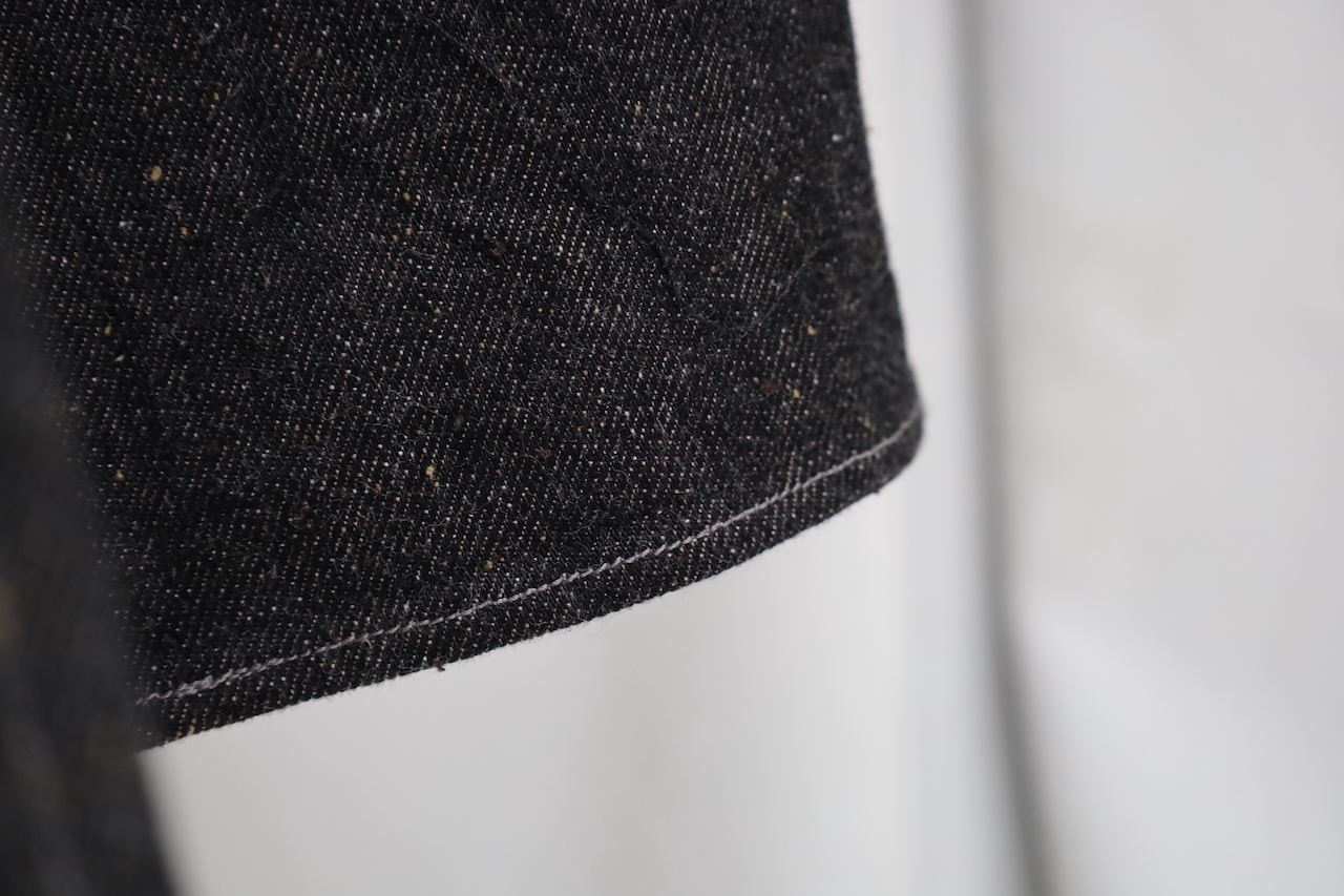 運針の細かさと生地端ギリギリのコバステッチが着ている状態でもよく分かると思います。