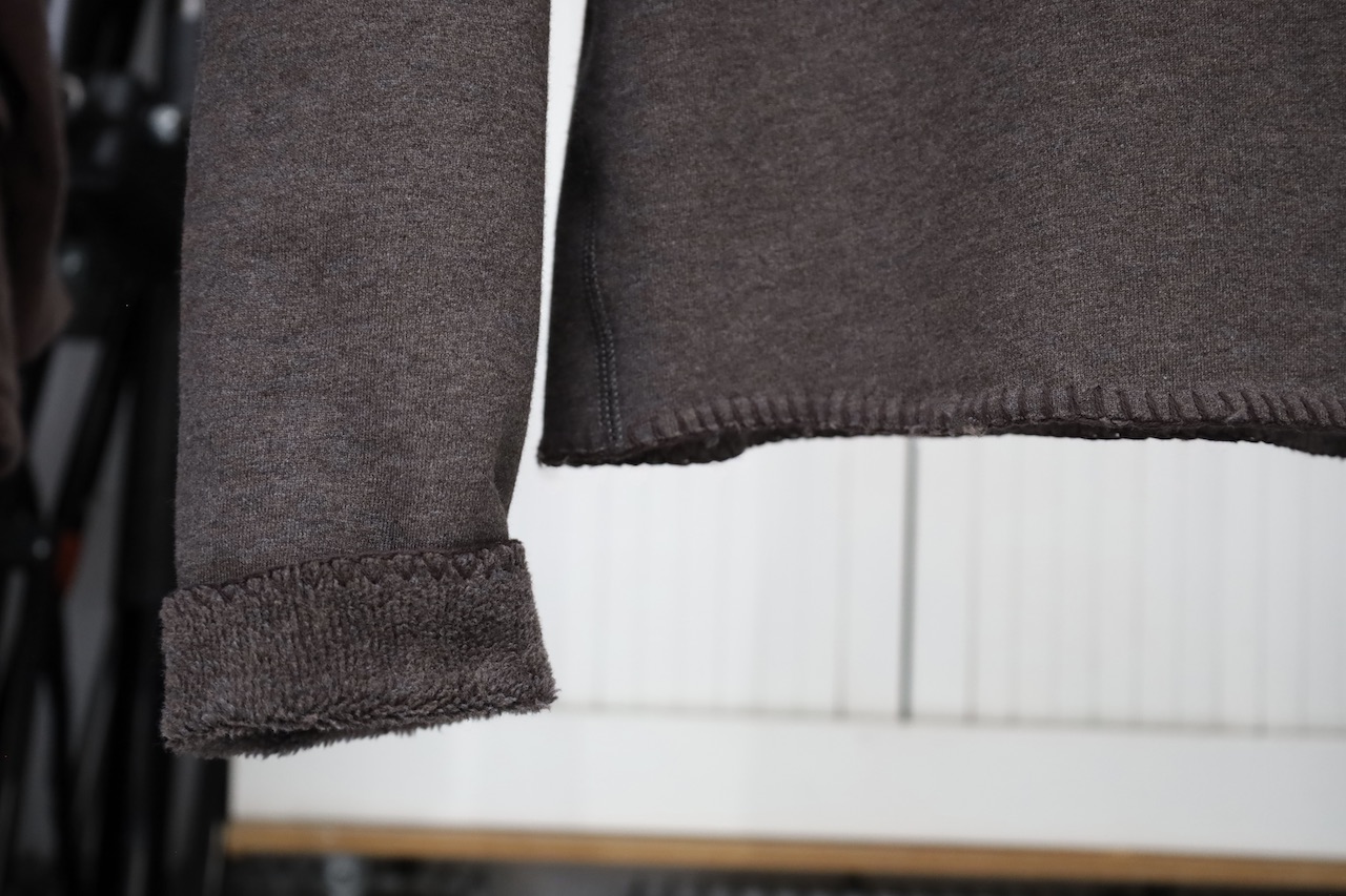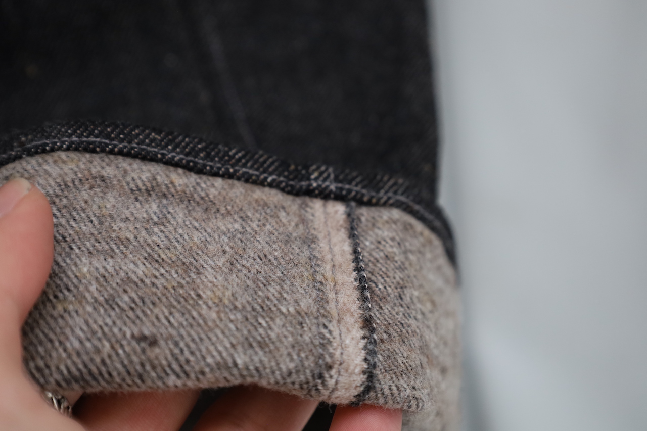 Against dark-toned warp yarns, the weft is made from softly raised, fuzzy cotton. Even though it’s 100% cotton, the inside—the part that touches the skin—feels exceptionally soft, thanks to that distinctive brushed texture.