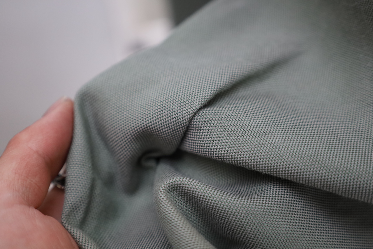 Even while worn, you can clearly see the fine stitch length and the edge-stitching set right up against the fabric edge.