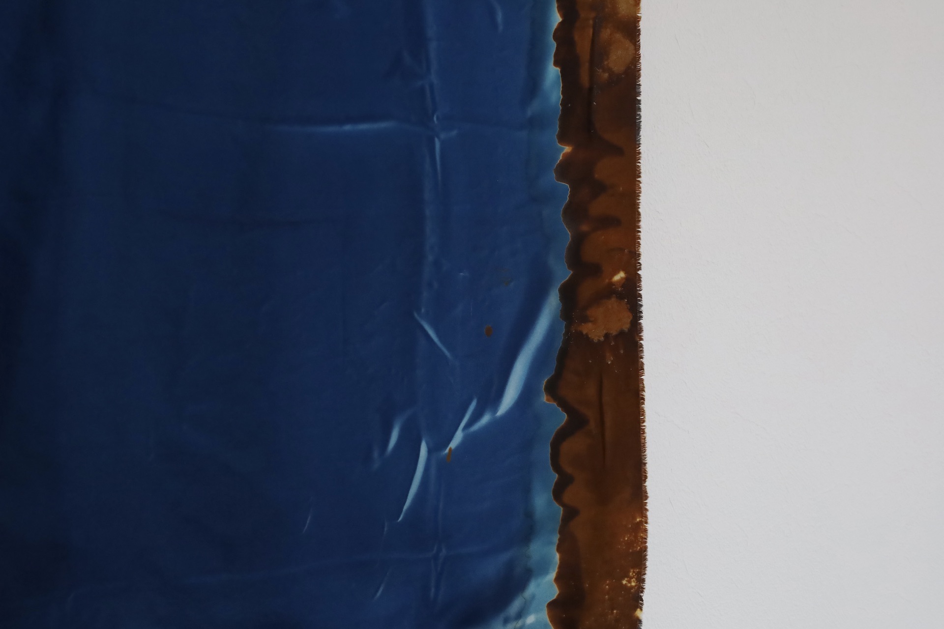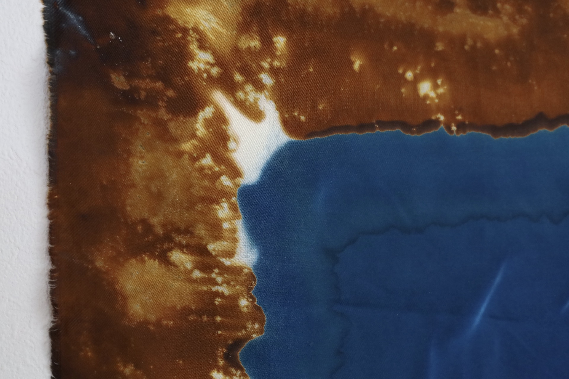 The blue area at the center applies Cyanotype—a photographic printing technique established in the 19th century that develops color through exposure to ultraviolet light—