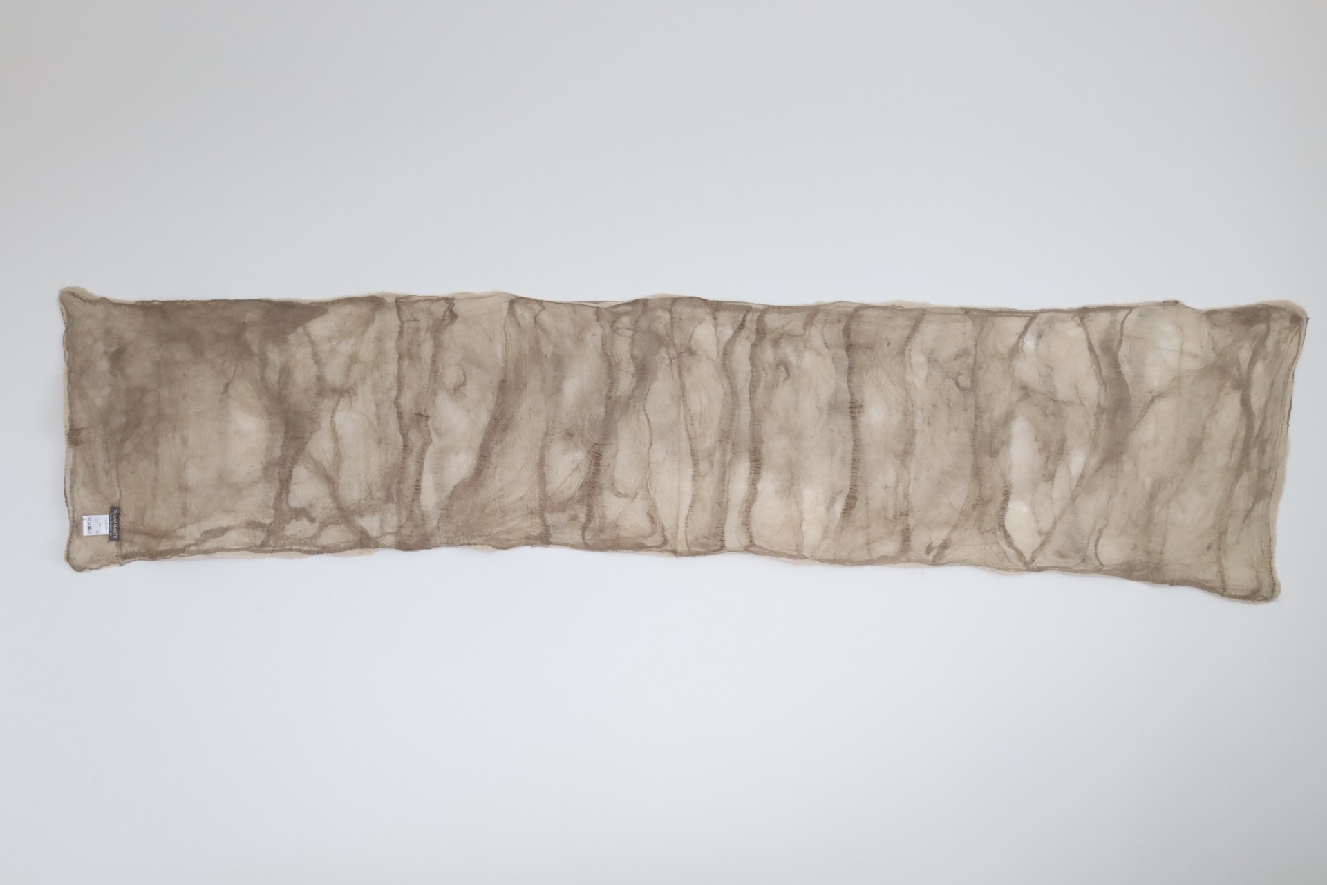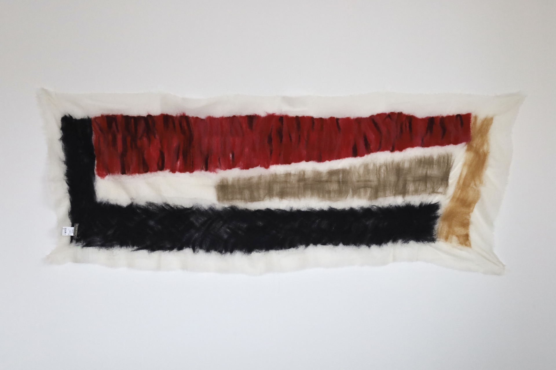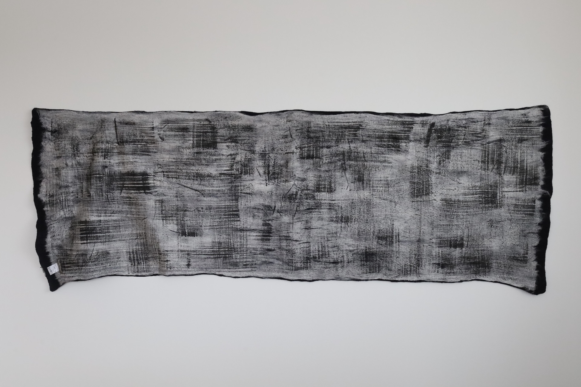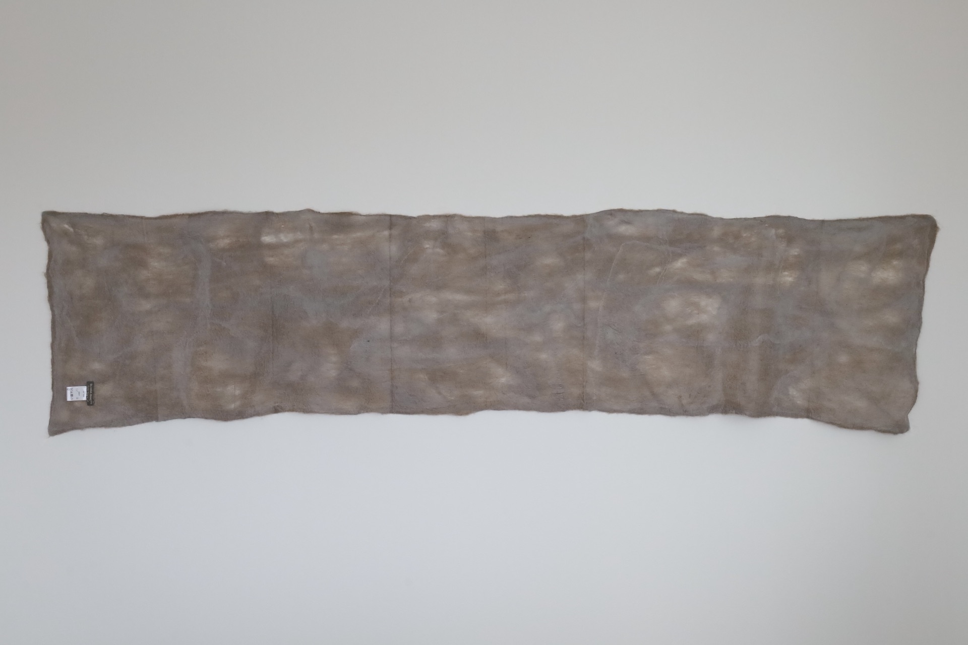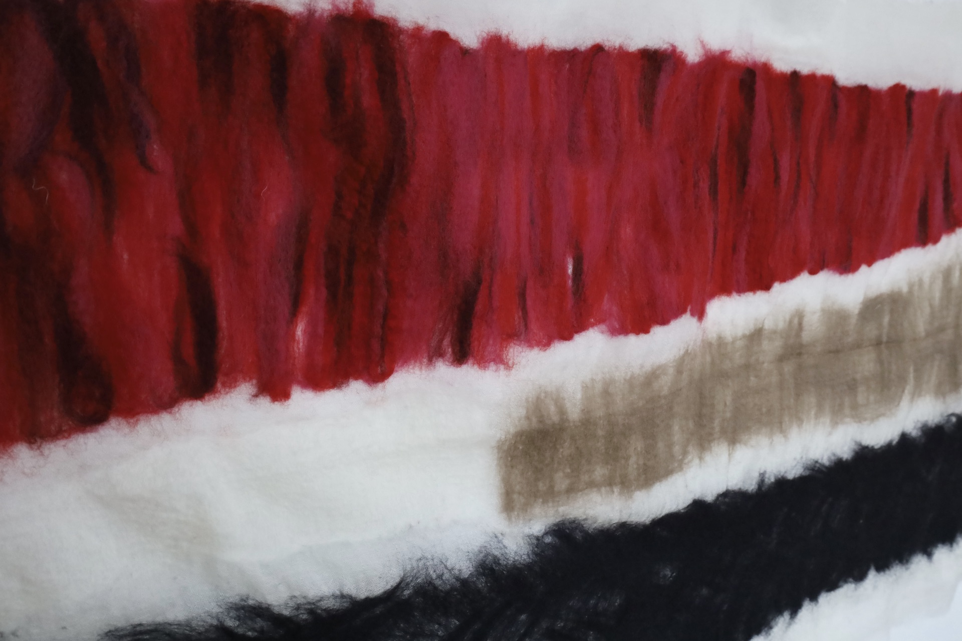 比較的厚みを持たせたウールをベースに、シルクファイバーを乗せ、その上からハンドペイントを施したもの。