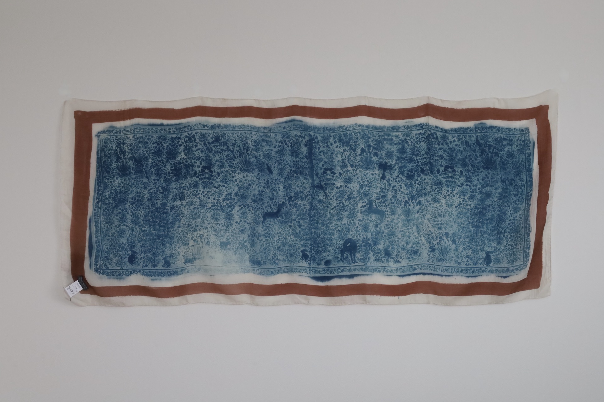 元あるレース素材の図柄をスカーフに写し、サイアノタイプの原理を用いて浮かび上がらせたもの。