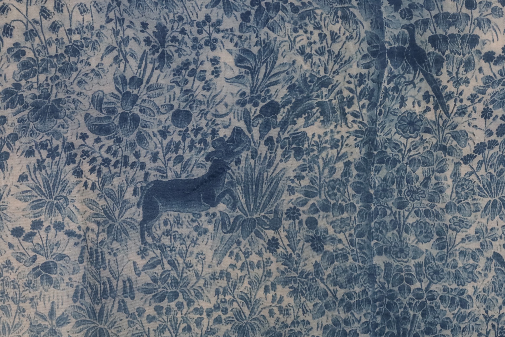 中心のブルーの箇所は、19世紀に確立された写真の現像技法、紫外線で発色させる”サイアノタイプ (Cyanotype)”をシルクの染色で応用しています。